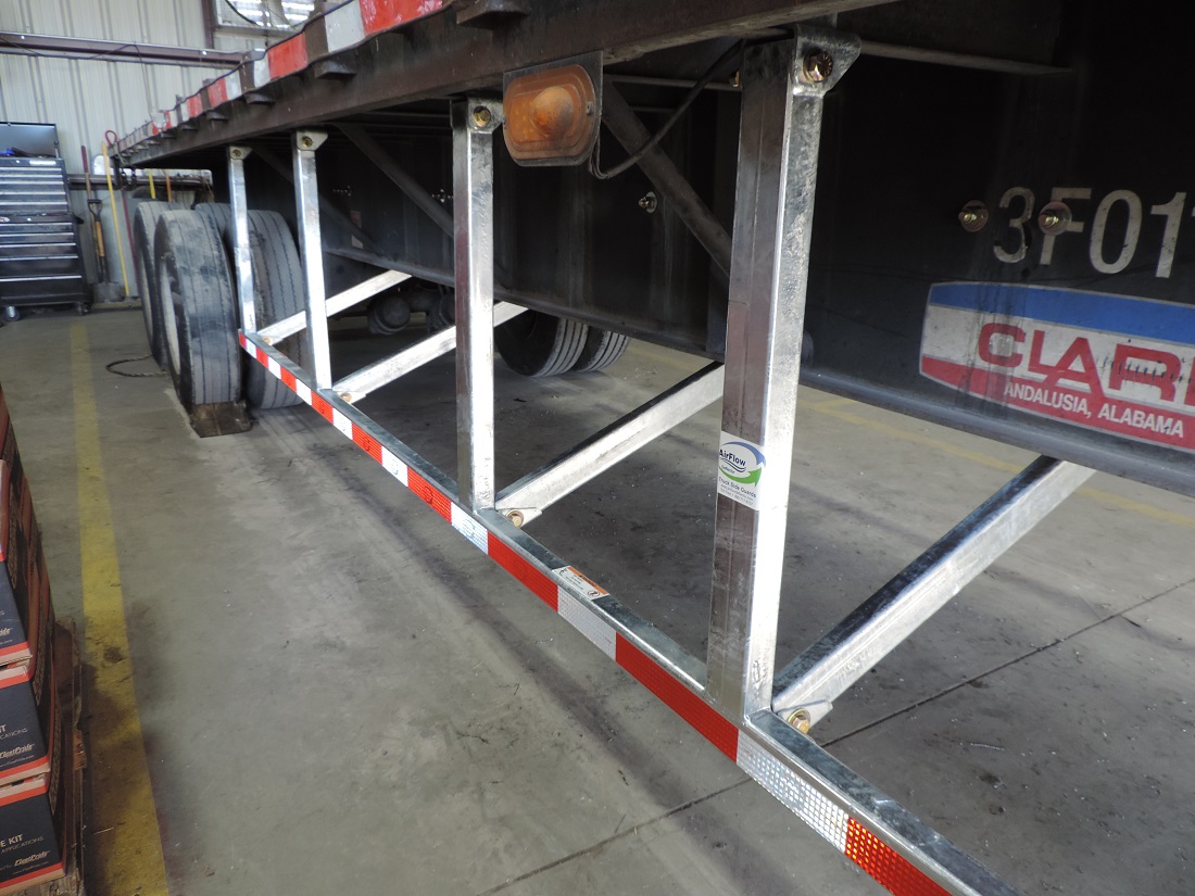 A close-up look at a side guard installed on a flatbed trailer.
